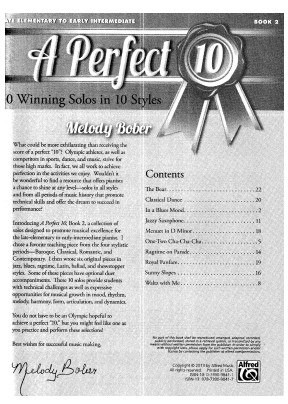 A Perfect 10 , Book 2، مجموعهای از تکنوازیهای پیانو است که برای ارتقای برتری موسیقی برای پیانیستهای اواخر ابتدایی تا اوایل سطح متوسط طراحی شده است. ملودی یک قطعه آموزشی مورد علاقه را از چهار دوره سبکی---باروک، کلاسیک، رمانتیک و معاصر---- انتخاب کرده و شش قطعه اصلی را در سبک های جاز، بلوز، رگتایم، لاتین، تصنیف و شوستاپر نوشته است. این 10 تکنوازی چالش های فنی و همچنین فرصت های بیانی برای رشد موسیقی در خلق و خوی، ریتم، ملودی، هارمونی، فرم، بیان و پویایی را برای دانش آموزان فراهم می کند. دانشآموزان برای رسیدن به یک "10" عالی، لازم نیست امیدوار المپیک باشند، اما ممکن است در هنگام تمرین و اجرای این انتخابها احساس کنند که یکی هستند! عناوین: * آلگرو * خرس * با حال و هوای بلوز * ساکسیفون جازی * منوی د مینور * رگتایم در رژه * ویواس * والس با من کمتر بخوان * منوی د مینور * رگتایم در رژه * ویواس * والس با من کمتر بخوان