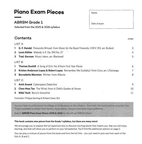 قطعات امتحان پیانو درجه ۱ ABRSM منتخب از Abrsm 2025 و 2026