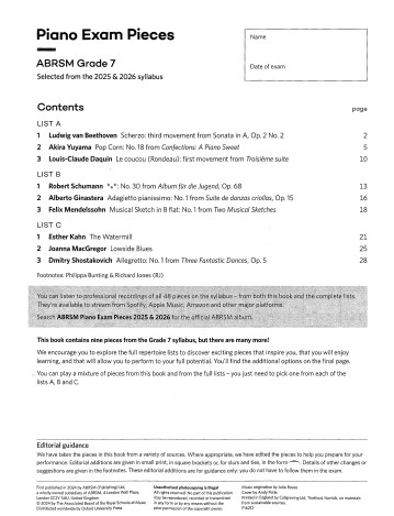 قطعات امتحان پیانو درجه ۷ ABRSM منتخب از Abrsm 2025 و 2026 همراه با فیلم قطعات در کانال سرزمین پیانو