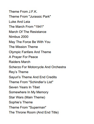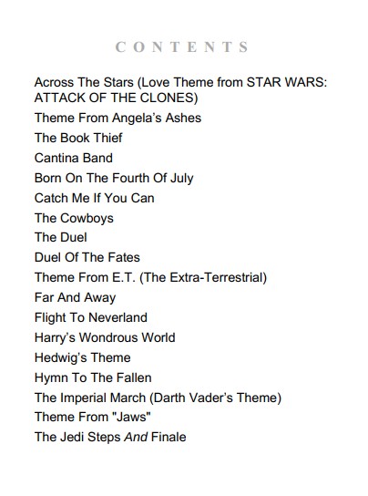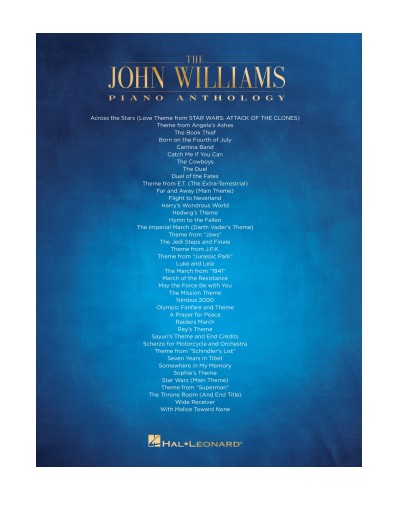 بیش از 40 تنظیم انفرادی پیانو زیبا از تمهای محبوب جان ویلیامز، از جمله: تم از خاکستر آنجلا • گروه کنتینا • اگر میتوانی مرا بگیر • تم از ET (فراز زمینی) • دنیای شگفتانگیز هری • تم هدویگ • سرود بر افتادگان • مارش امپراتوری (موضوع دارث ویدر) • تم از «آرووارها» • تم از «پارک ژوراسیک» • راهپیمایی از «1941» • تم ماموریت • هیاهو و تم المپیک • راهپیمایی مهاجمان • تم ری • شرزو برای موتور سیکلت و ارکستر • تم از "فهرست شیندلر" • جایی در حافظه من • تم سوفی • جنگ ستارگان (تم اصلی) • با بدخواهی به سوی هیچکدام • و موارد دیگر.