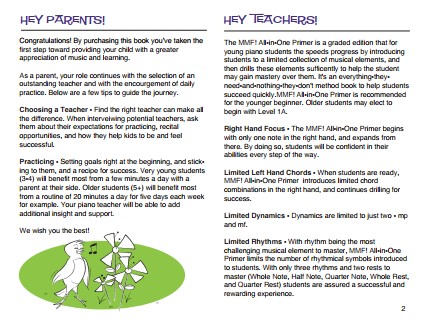 توضیحات درباره این دوره دوره آموزشی پیانوی مقدماتی MMF! All-In-One برای هنرجویانی در نظر گرفته شده است که هیچ تجربه قبلی در موسیقی ندارند. هر درس با دقت ترتیب داده شده است تا حداکثر موفقیت تضمین شود. بسیاری از قطعات در این روش، قطعاتی برای همکاری دارند. این قطعات به دانشآموزان اجازه میدهند تا بر توسعه مهارتهای خاص، مانند ریتم یا وزن، تمرکز کنند و باید با هم تمرین شوند. درسهای تئوری، مانند «رنگآمیزی نت!» و «همه چیز به هم ربط دارد!»، باید در طول درس توضیح داده شوند و شروع شوند و سپس در خانه تکمیل شوند.