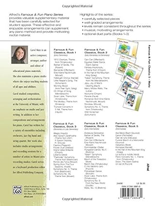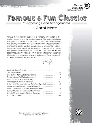 «معروف و سرگرمکننده: آثار کلاسیک»، کتاب پنجم، مقدمهای شگفتانگیز بر شاهکارهای جاودان آهنگسازان بزرگ ارائه میدهد. این آثار که شامل تنظیمهایی از تمهای سمفونیک، اپرا و ادبیات کیبورد هستند، با دقت انتخاب شدهاند تا برای دانشآموزان در سطح متوسط جذاب باشند. عناوین: آوه ماریا (باخ-گونو) * کانن (پاخلبل) * کلر دِ لون (دبوسی) * مارش تشییع جنازه یک عروسک خیمهشببازی (گونو) * هابانرا (بیزه) * هورن پایپ (هندل) * در تالار پادشاه کوهستان (گریگ) * لا دونا ای موبایل (وردی) * کنسرتو پیانو شماره ۱ تم (چایکوفسکی) * سوان، دِ (سن سانس) * آن بِل دی (پوچینی)
